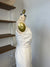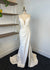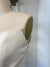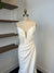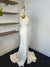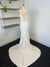 Ivory crepe fabric, sheath style gown, ruching detail on bodice and skirt front